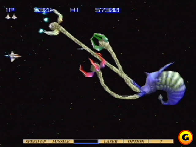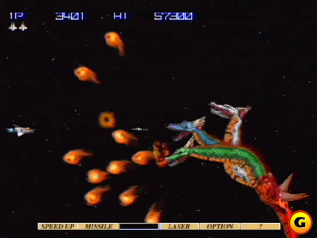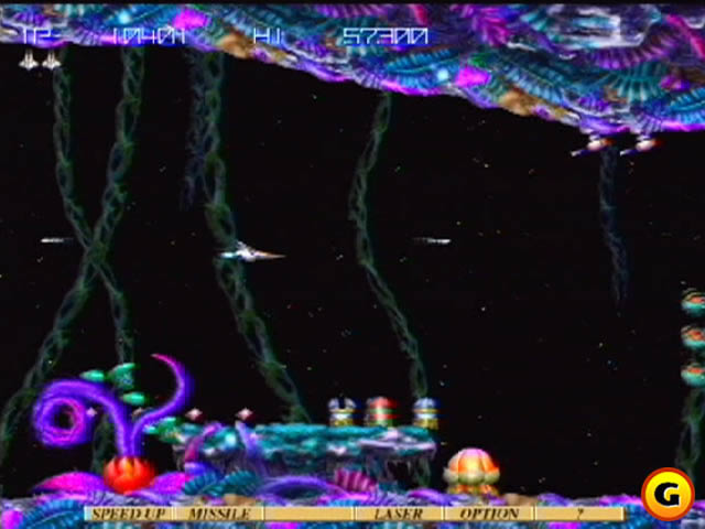 初代的GRADIUS最早是在85年的商用机上出现的。在此之前,最流行的射击游戏是以NAMCO公司制作的《XEVIOUS系列》为主的纵版射击游戏。GRADIUS出现后引起了不小的轰动,它以其特有的魅力:横版射击类型、通过获取能量胶囊可以增强威力、能够配备子机等特点在众多的商用机中脱颖而出。