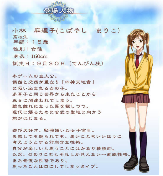 1995年在『少女漫画』中把朱雀的巫女美红做为主人公”朱雀•青龙篇”的连载被开始,博得了欢迎。其后动画片化也很受欢迎。从连载开始10年以上,获得着从爱好者热的支持。被游戏化,描画了第一代的巫女,奥田多喜子的冒险的『不可思议的游戏•玄武开传』。也发售了电视剧CD,2006年8月25日,第4卷发售预定。本作品作为外传渡濑悠宇的监修,把主人公的麻理子和作为青梅竹马的木工的二人做为中心故事展开。