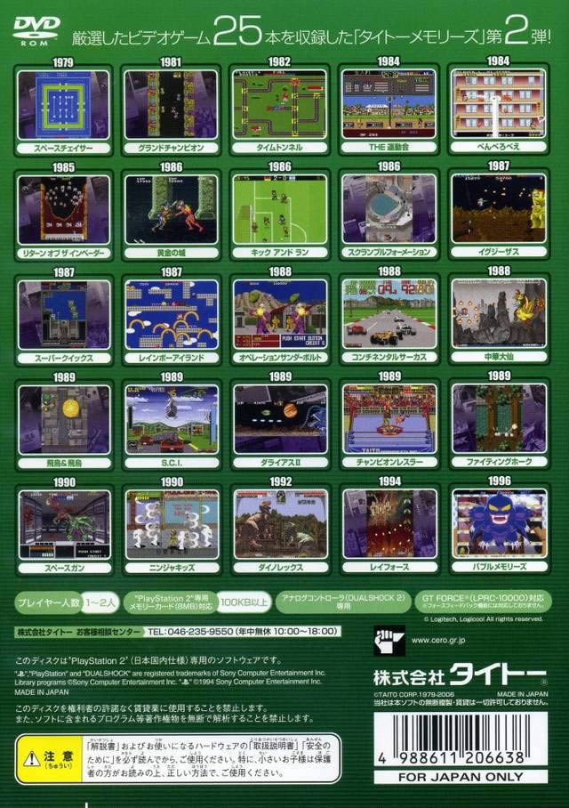 在TAITO MEMORIES上卷、下卷陆续发售后得到了广大玩家的好评与爱戴。甚至还有一些玩家因可以重温孩童时的那份愉快与激动而爱不释手。而為了答谢眾多忠实玩家的爱戴最新作《TAITO MEMORES 2》的下卷将在2007年3月29日再现25款经典游戏:《Rainbow Island* **tra》、《Bubble Symphony》、《Great Swordsman》、《Gyrodine》、《Super Qix》等经典街机作品至诸位玩者的面前。就让我们来重拾那份欣喜与感动吧。