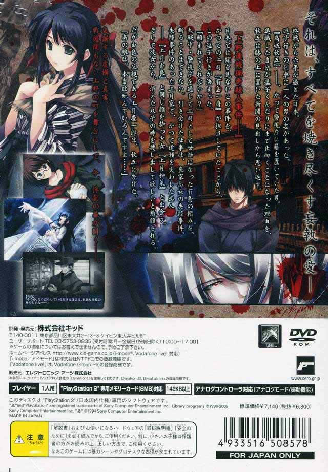 05年4月发售的pc版,到12月底才移植到ps2。据说是05年18岁以上推荐奖获得的游戏。当然了,ps2版不会有什么过激的东西,之所以定为18岁以上推荐游戏,大概是因为有血腥,多少有一些阴森恐怖的色彩。