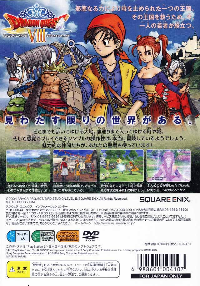 《勇者斗恶龙 8》延续系列作的传统,由知名漫画家 鸟山明(代表作:七龙珠)负责角色设定,LEVEL-5 负责开发,本代一改先前系列作的 2D 图像方式,而改以全 3D 的方式来构成,并以独特的卡通赛璐珞风格来呈现鸟山明风格的漫画人物,是一款以崭新手法保留系列作原味的精采作品。