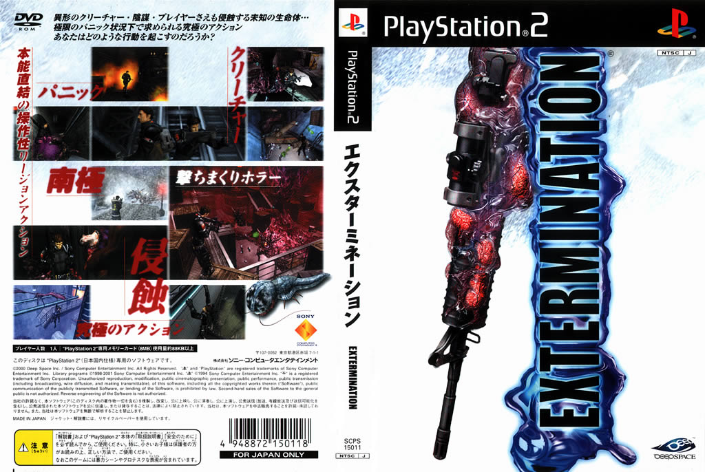 SCEI在2000年2月份“PS FESTRIVAL 2000”公开的一款PS2动作游戏“灭绝者(Extermination)”,自从当初惊虹一瞥后,几乎没有后续消息公布,如今SCEI再度发表“Extermination”新消息,而且表现可圈可点。这是一款3D动作游戏,玩家扮演美国特殊侦查部队成员 丹尼斯,奉命到南极大陆调查秘密基地为何发生变故,因而牵扯到外星病毒入侵、异形肆虐的恐怖事件(这跟1980年由寇特罗素主演的电影“突变第三型 (The Thing)”剧情蛮像的)。游戏因为有PS2强力硬体充分发挥,画面表现可圈可点,而表达的“电影感”也让人印象深刻,游戏预计3月8日发售,PS2玩家又有好游戏可以期待了。