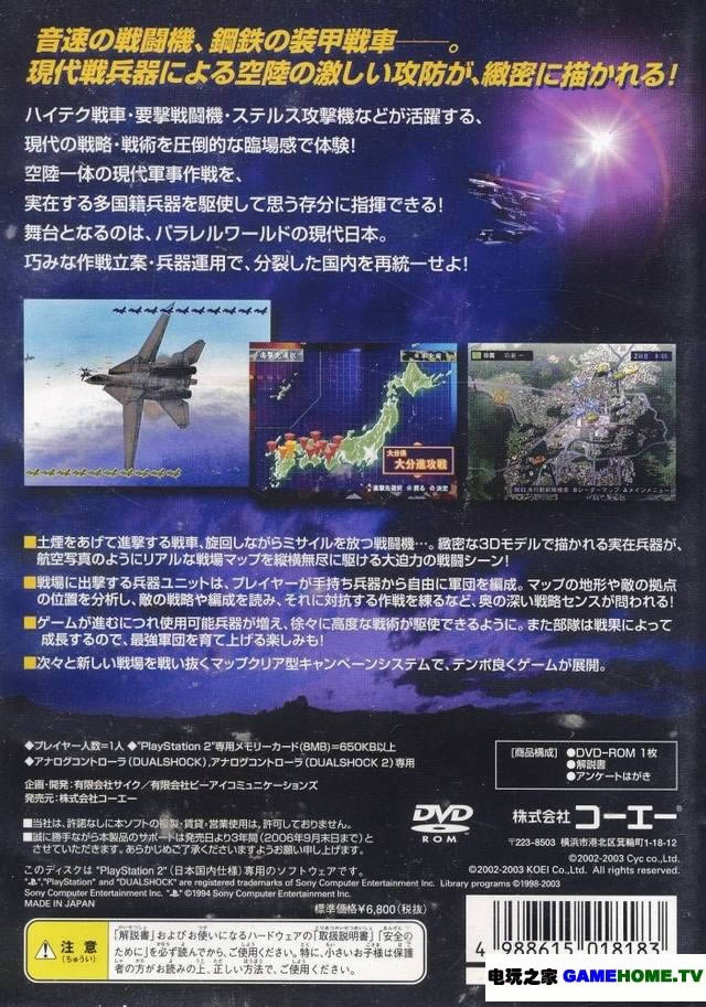据KOEI宣布指出,他们决定把在PC上推出,以高科技战车及高速战斗机等实名兵器配合整体作战的现代“地空整体作战(Air Land Battle)”为主题的战争仿真游戏《凯歌的号炮Air Land Force》移植到PS2上发售,游戏以日本为舞台,描述在日本境内由于复数的军事势力互相征战而导致军阀割据分裂。而在战场地图上也以实时战斗画面表现,玩家必须善用陆海空三军的整体战力布置才能获得胜利,完成任务目标。
