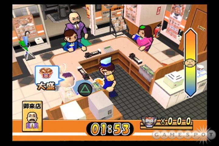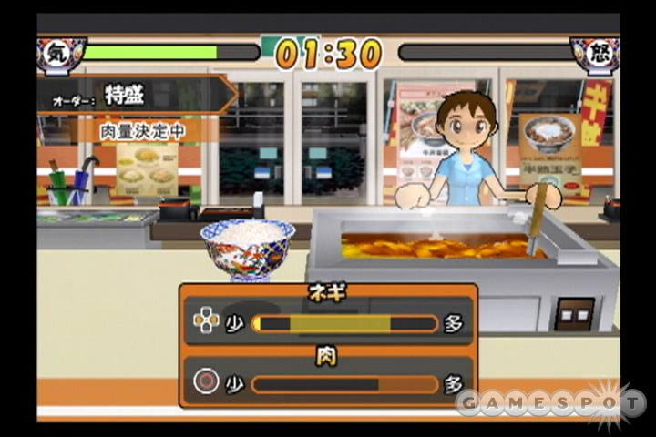 而「接客胜负」则是以製作出最完美牛丼为目标的游戏模式,玩家将必须谨慎控制好餐点的茶水与饭量、葱与肉的比例、酱汁与配料的份量...等等,最后以快速连打按钮的方式加入「真心」,製作出评价为「特上」「至高」,令顾客感动流涕、黯然销魂的牛丼。