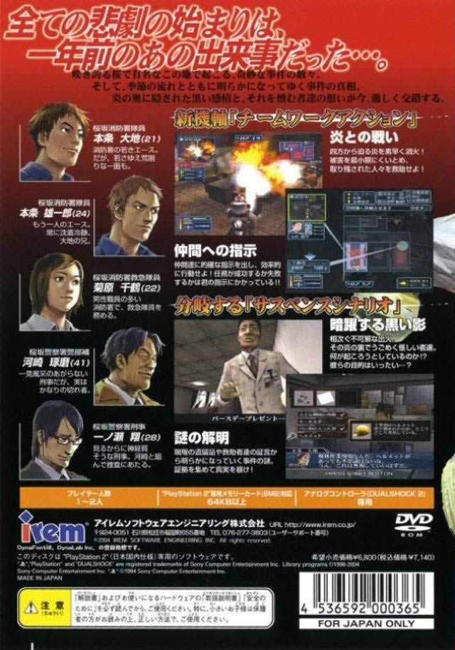 以樱坂街为背景,叙述消防队打火弟兄与火灾搏斗的动作冒险游戏《樱坂消防队》,游戏并非是单纯地在各个舞台灭火而已。对于会随着时间蔓延扩大的火势,以及会阻挡去路的障碍物,玩家有时要靠自己打通通路,有时要跟伙伴合作解决难题,以消灭火势并拯救陷入火场的老百姓。由于火势会随着时间不断变化及蔓延,这考验着玩家的临场判断力及行动力等等各种临机应变的能力,在一边体验打火英雄的感觉之余,还可以一边体验同伴合作解决困难的乐趣。由于是这样的游戏概念,因此本作中也有 2 人合作的模式,让乐趣更为增加。