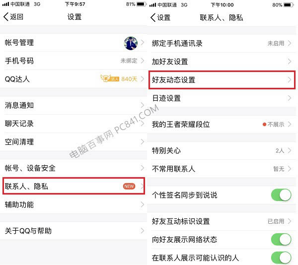 二、在设置中,首先进入“联系人、隐私”设置,然后再继续点击进入“好友动态设置”,如下图所示。