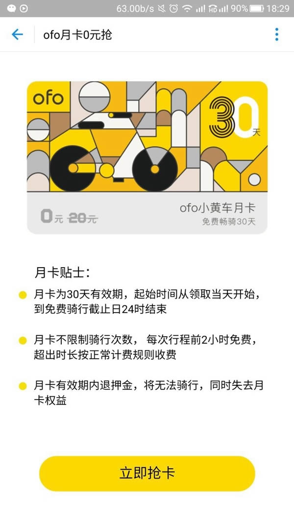 2.月卡有效期为30天,起始时间从领取当天开始,到免费骑行截止日24时结束