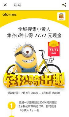 2017年7月7日至7月14日期间,完成一次距离超过200米、时间超过2分钟的有效骑行订单,即可获得【小黄人】一张,集齐五种不同的【小黄人卡】即可兑换77.77元现金红包。